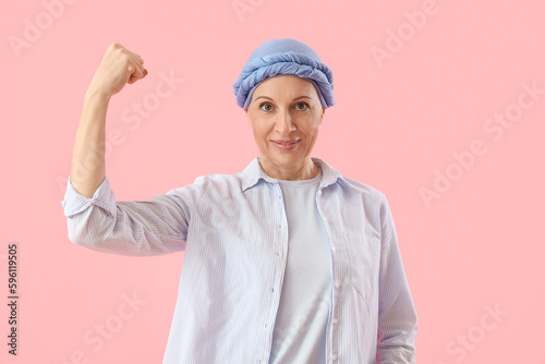 Mature woman after chemotherapy showing muscles on pink background