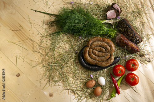 Meat and sausage cooked on organic farms, according to traditional recipes. Vegetables from the garden, eggs, food spread out on a wooden table.