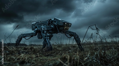 Mechanical Wanderer: Robot Strolling Through Field With Stormy Skies