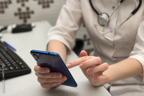 Medical technology concept. Doctor working with mobile phone and stethoscope in modern office at hospital.