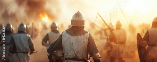 Medieval battle scene with armored knights in combat, smoke, and fire, evoking historical warfare and epic conflict.