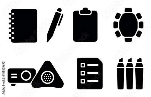 Meeting icons set: notebook, pen, clipboard, projector, microphone
