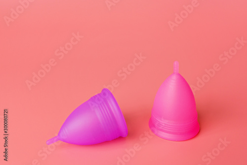 Menstrual cups on pink background. Alternative feminine hygiene product during the period. Women health concept. Copy space. Eco friendly concept, zero waste product. mockup, template