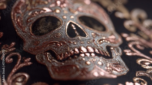 Metallic skull print on silk fabric. Luxury textile. Rose gold and black Halloween design