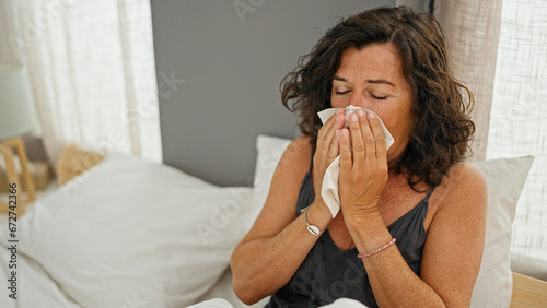 Middle age hispanic woman sitting on bed being sick sneezing at bedroom