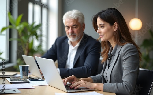 Middle age man and woman business workers using laptop working at office. High quality. High quality