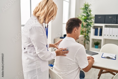 Middle age man and woman doctor and patient auscultating pulmonary sound having medical consultation at clinic
