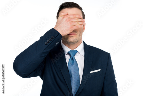 middle aged businessman in formal wear closing eyes with hand isolated on white