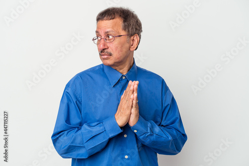 Middle aged indian man isolated on white background praying, showing devotion, religious person looking for divine inspiration.