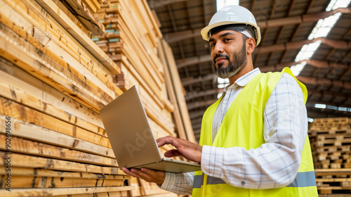 Middle Eastern Saudi Arabian Carpenter Using Laptop in Lumber Warehouse, Industrial Woodworking, Construction Industry Professional Engineer
