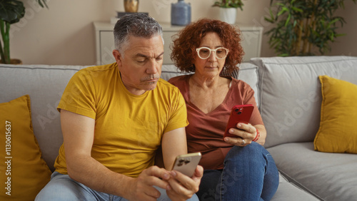 Middle-aged couple sitting together in their living room, both focused on their smartphones while relaxing on a comfortable sofa with yellow cushions in an indoor setting