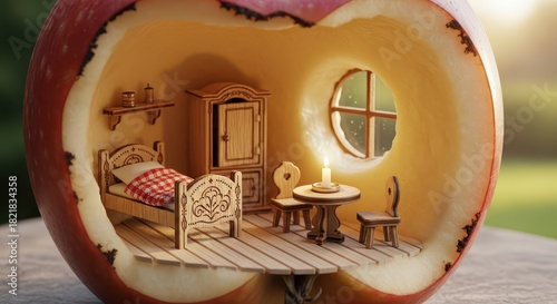 Miniature cozy dwelling carved inside a hollowed-out piece of fruit