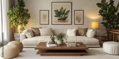 Minimalist living room, neutral tones, beige couch, wooden coffee table, large potted plants, fiddle leaf fig, botanical wall art, woven baskets, natural textures, organic shapes, calm atmosphere, Sca