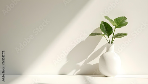 minimalist white vase with green leaves against light wall creates serene atmosphere. natural textures and soft shadows enhance calming effect of scene
