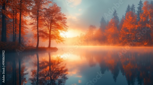 Misty Autumn Sunrise Over Serene Lake Reflections