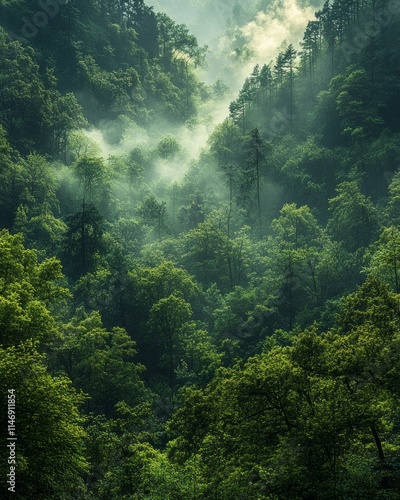 Misty Morning in a Dense Green Forest with Towering Trees and Lush Foliage, Capturing the Serenity of Nature's Embrace