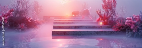 Misty Steps Amidst Geometric Shapes and Floral Accents at Dawn