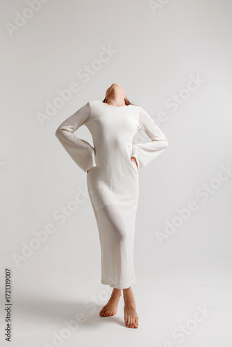 Model poses gracefully in a cozy white dress against a minimalist background indoors