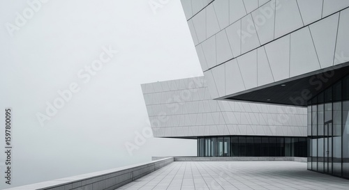 Modern Architecture: Sleek White Building Exterior with Geometric Design and Foggy Sky