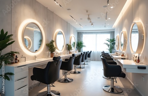 Modern beauty salon interior. Empty hairdressing studio with mirrors, chairs. Pro space for hair stylist clients. Stylish design with mirrors, lights. Aesthetic workplace in contemporary building.