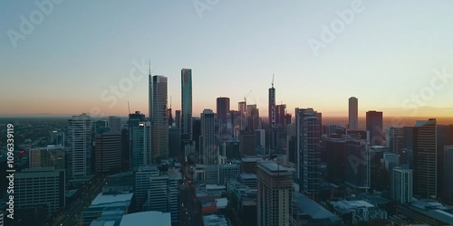Modern City Skyline with Office Buildings and Drone View at Sunset