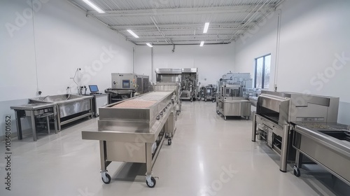 Modern Commercial Kitchen Interior with Professional Equipment and Appliances for Food Preparation and Cooking in a Clean, Spacious Environment