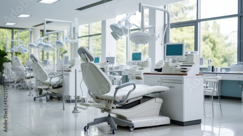 Modern dental office with white chair in well lit, sterile environment for a contemporary feel