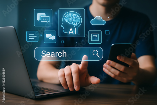 Modern digital concept of AI search assistant with glowing holographic icons symbolizing innovation communication and knowledge