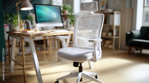 Modern ergonomic office chair with mesh backrest and adjustable headrest in home workspace with desktop computer and natural sunlight