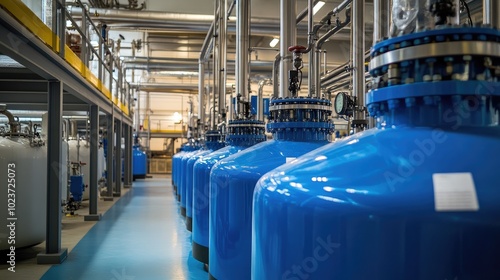 Modern industrial blue tanks with advanced valves and piping in a factory, highlighting technological innovation. No people.