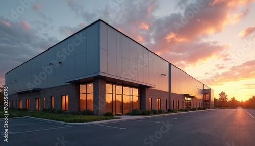 Modern industrial building exterior at sunset with empty parking lot. Commercial real estate property with glass windows reflecting colorful sky. New warehouse office structure for business