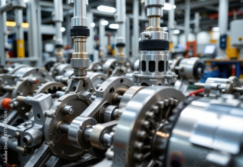 modern industrial factory machinery close up gears motors automated production clean metallic surfaces bright technical lighting detailed mechanical engineering