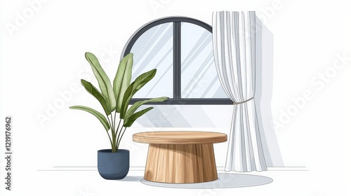 Modern interior design with a minimalist plant and a wooden table near a large window
