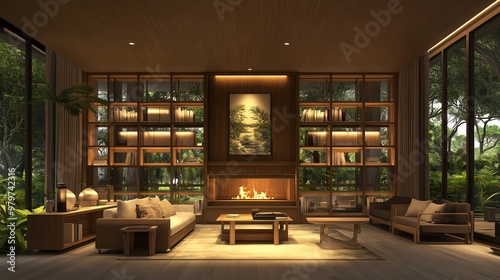 Modern living room with spacious design, featuring natural light, greenery, and a cozy fireplace for a warm atmosphere.