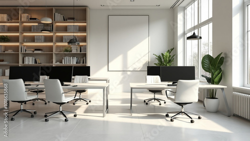Modern office room interior with coworking space and fashionable furniture. White Mockup frame.