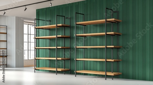 Modern Retail Display: Wooden Shelves with Black Metal Frame against Green Textured Wall in Spacious Store