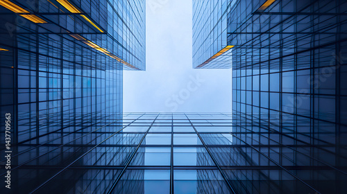 Modern skyscrapers create stunning view from below, showcasing glass and light