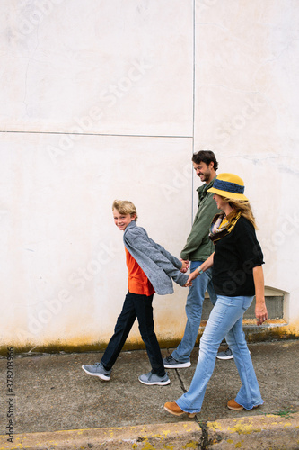 Mom, Dad, and Preteen Son Hanging Out In Front of a Blank Wall