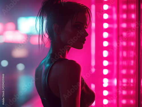 Moody Neon Portrait of a Woman in Silhouette Against Vibrant City Lights