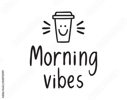 Morning vibes with cup of coffee doodle hand drawn lettering. Paper Coffee cup. Sticker vector for coffee house, cafe, social media post.