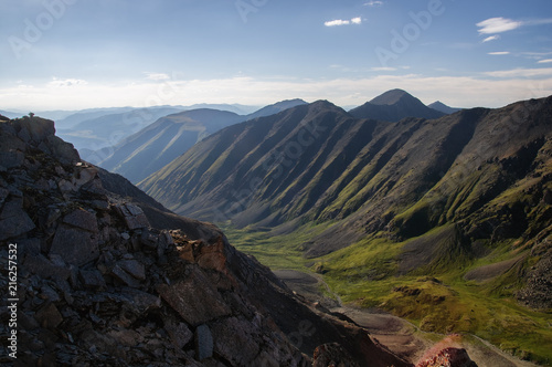 Mountain sunset valley with green grass and ranges of hills rocks on a horizon skyline under blue sky Altai Mountains Siberia Russia
