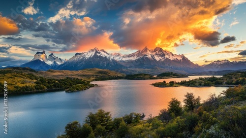 Mountains, lake, sunset; fiery sky, calm water.
