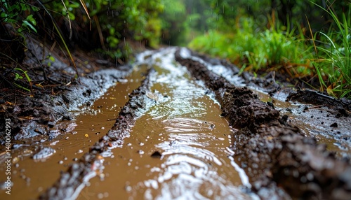 Muddy Trail with Water Puddles and Lush Greenery in Rain