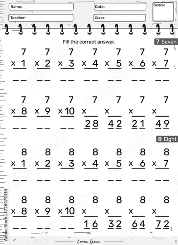 Multiplication game of number seven and eight or 7 and 8