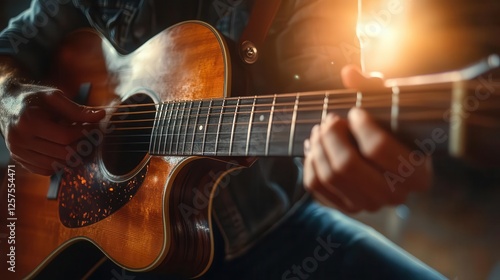 Music, close-up of hands strumming a guitar, bright studio background