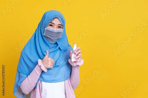 Muslim asian woman with traditional dress wearing medical face mask under the outbreak of the virus,Wash her hands with an alcohol gel isolated on color background