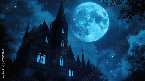 Mysterious Castle Silhouette Against a Full Moon and Starry Sky