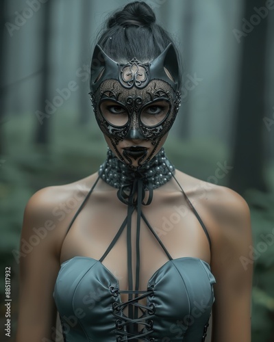 Mystical Gothic Portrait Enigmatic Woman in Ornate Mask and Intricate Jewelry Captivating Eyes and Braided Hair Amidst a Foggy Forested Background Evoking Dark Fantasy and Ethereal Beauty Brainstormin