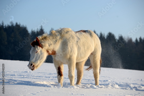 nach dem Bad im Neuschnee, geschecktes Pferd schüttelt sich den Schnee aus dem Fell