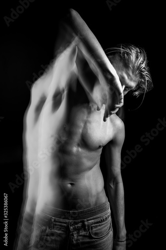 naked torso man handsome young man. abdominal and arm press. looks with reproach. Double personality back and white portrait. Long exposure creative moody creepy art series of works.